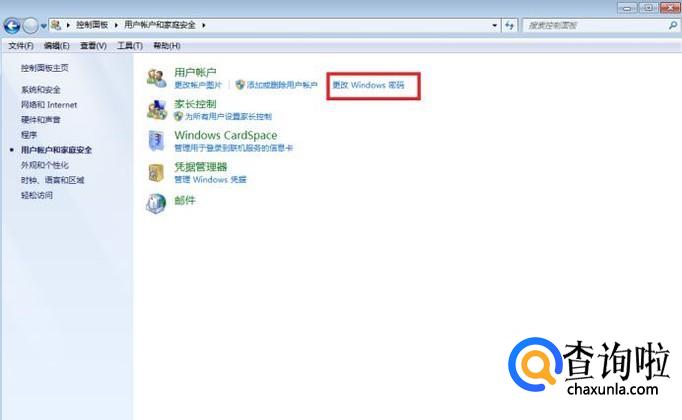 在用户账户与家庭安全界面,点击“用户与账户”下属的“更改Windows密码”选项。