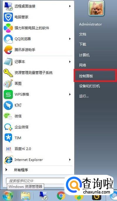 点击左下角的“开始”选项,进入开始菜单后,点击菜单栏右侧的“控制面板”选项。