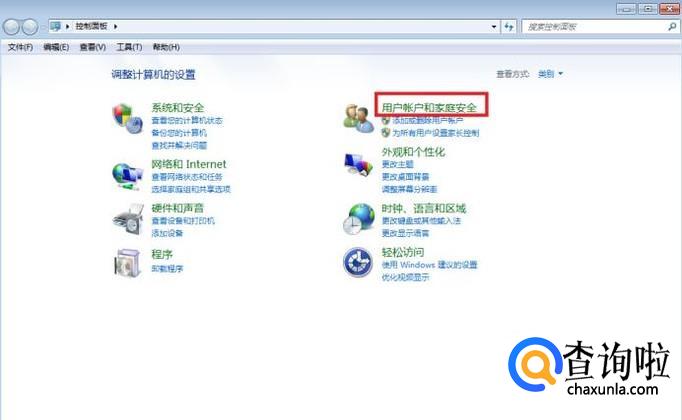 进入控制面板后,点击“用户账户与家庭安全”选项。