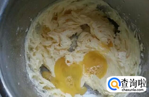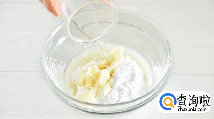 隔水将黄油融至软化,微呈水状,加入细砂糖,搅拌至无颗粒状。