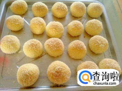 将揉好的面团,扯成一个个小圆团。碗中剩余的蛋液分两次刷在小圆团上。第一次刷在扯好的小圆团上。然后放至到烤箱烘烤。