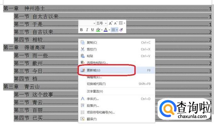 如果是因为文中经过修改而导致文中页码和目录中显示页码不一致,那么我们可以整体选中目录后,右键单击选择“更新域”。