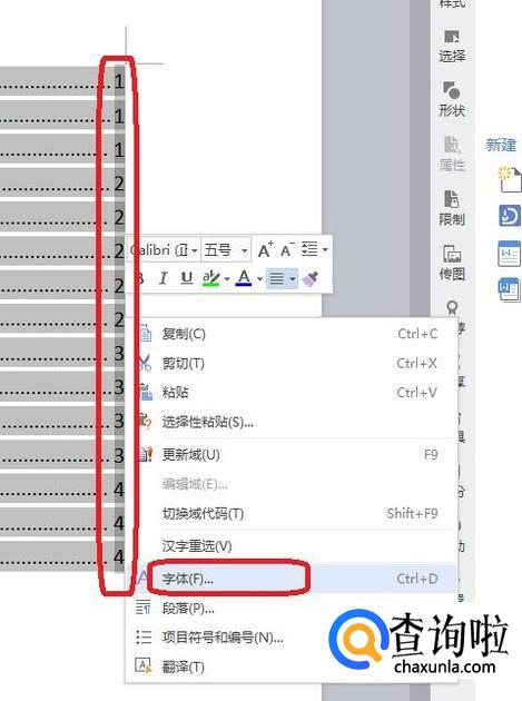 如果只是整体修改目录页码的格式的话,那么按住“alt键”,用鼠标全选页码后,右键单击,选择“字体”,就可以对页码字体进行设置。