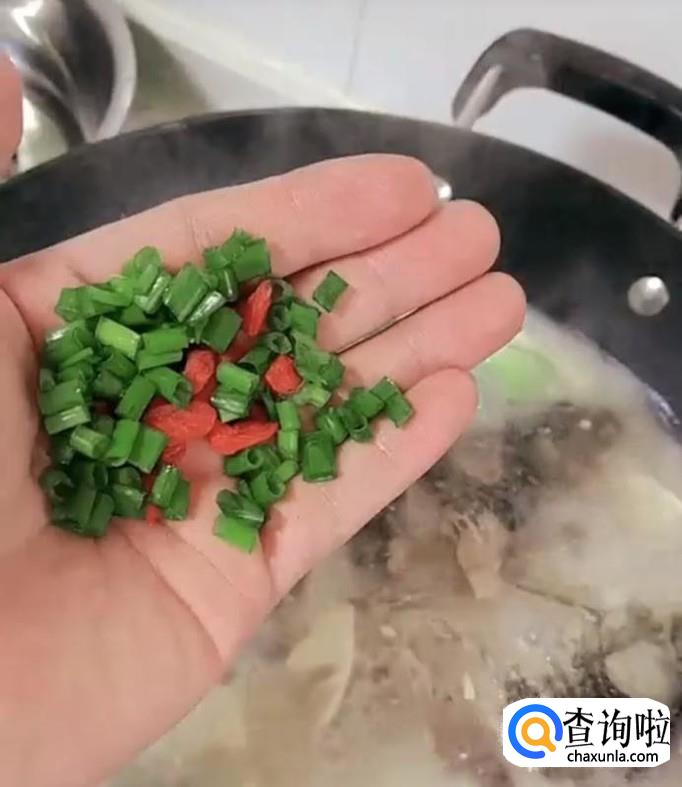 炖煮一会儿待豆腐熟了,就可以撒入枸杞子和香葱。