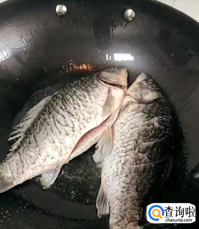 鲫鱼收拾干净,鲫鱼的两面都斜着切几刀。将豆腐切块,姜切丝,葱切碎,香菜切段,青菜几片备用。