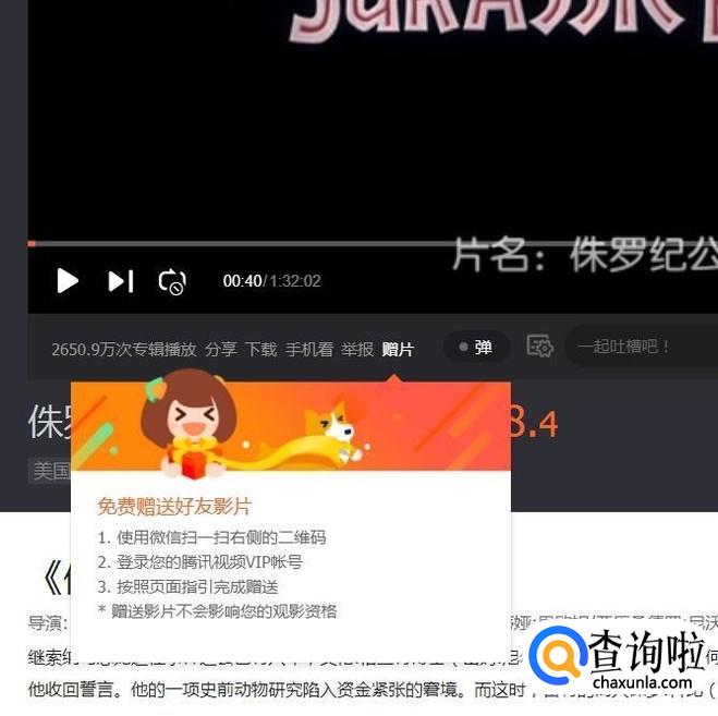 在视频播放页面中,点击页面中的“赠送”按钮,会弹出相关信息提示,需要我们使用微信扫一扫功能,扫描网页中的二维码信息。