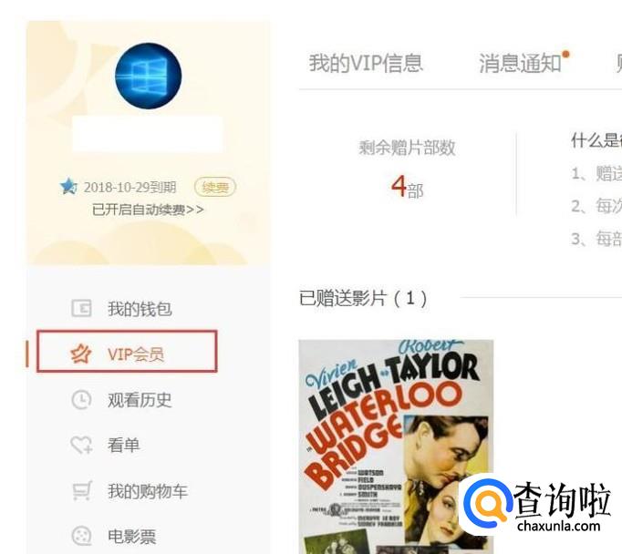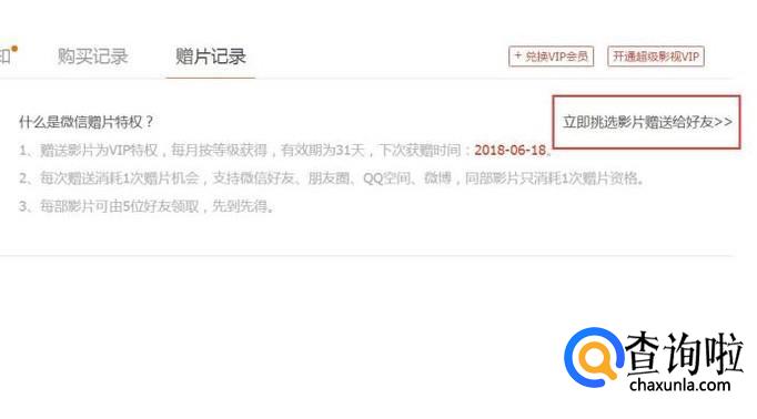 在VIP页面目录中,可以看到“赠片记录”菜单项,点击该菜单项页面,并选择影片赠送给好友。
