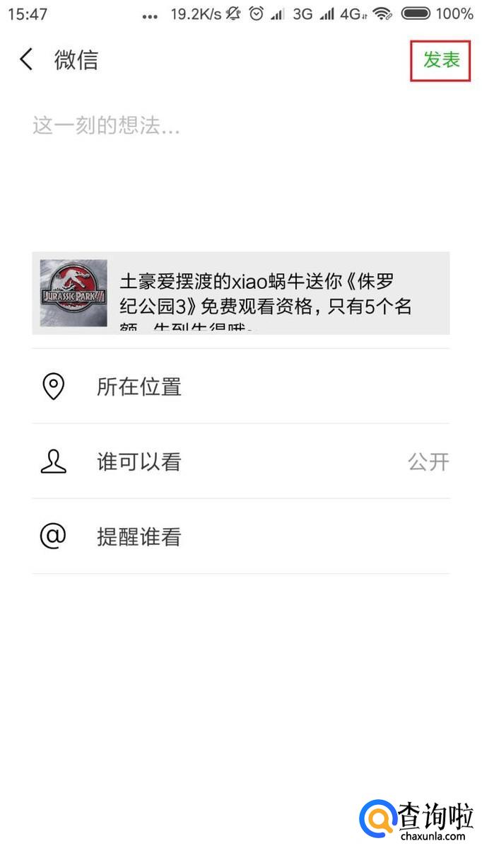 最后,在微信朋友圈编辑页面中,按照页面信息提示,点击右上角“发送”按钮,将该信息发送到朋友圈页面,好友看到该信息之后,点击进入即可领取该影片。