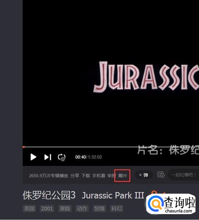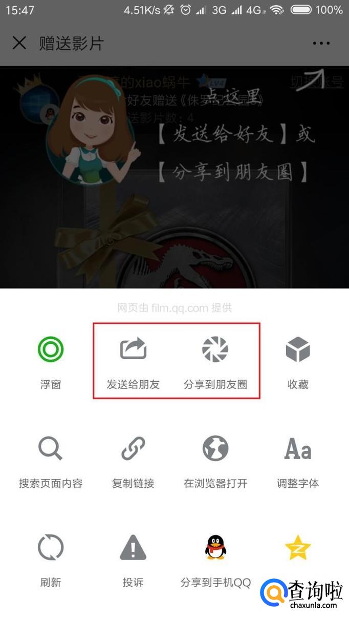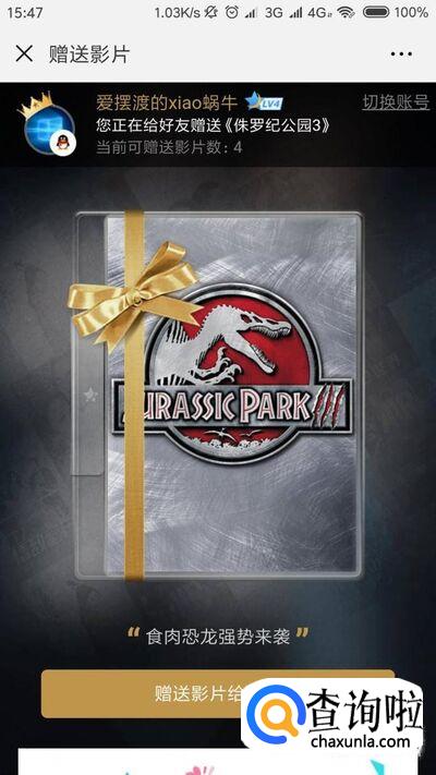 接下来,使用微信扫描该二维码信息之后,在打开的页面中,点击“赠送影片给好友”菜单按钮。