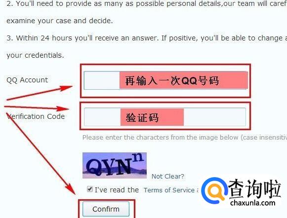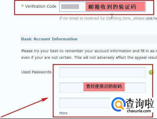 然后登录上一步填写的邮箱,将验证码复制下来,填写到“Verification Code”处,然后按照页面的要求,一步步写上相关信息,这些信息如果忘记了可以不填,但是填写的越详细,申诉越容易成功。