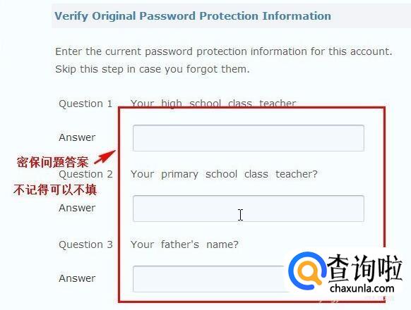 1)密保问题的答案(密保问题已经给你翻译成了英文,如果看不懂就复制下来去翻译一下),答案一旦填写,就应该要保证正确,如果不记得了或者很模糊,那就不填写了,跳过这一项;