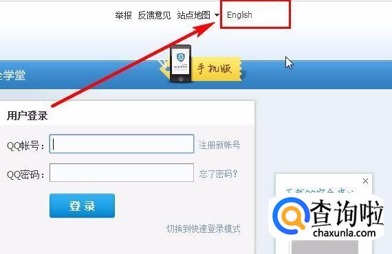 首先进入QQ安全中心,找到右上角的“English”点击,也就是进入英文版。
