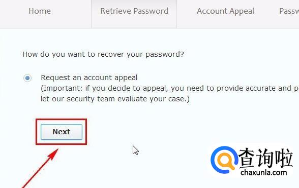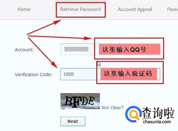 在弹出的页面中,点击“Retrieve Password”,在Account”处输入你需要申诉的QQ号码,“Verification Code”处输入下面的验证码,点击“NEXT”进入下一步。