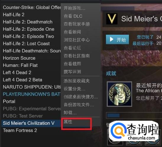 鼠标移动到文明5,然后右键,在弹出的对话框中点击属性