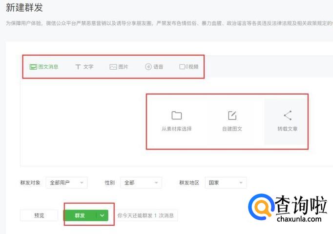 进入群发页面后,输入文字、图片、音频,点击“群发”,即可完成公众号的推文。