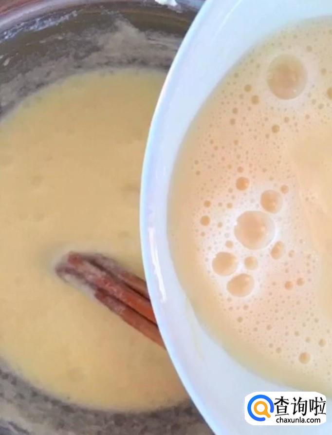 接着,我们将煮开的白糖水倒入蛋黄中,倒的过程中不停的搅拌,放凉备用