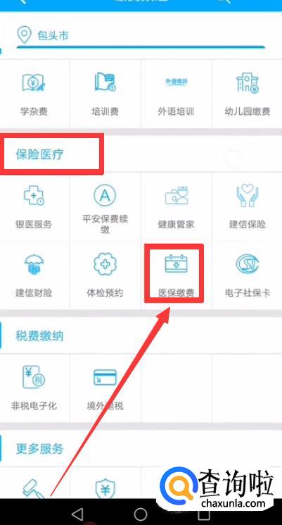 进入【更多】之后,我们向下滑动找到【保险医疗】,然后点击【医保缴费】。