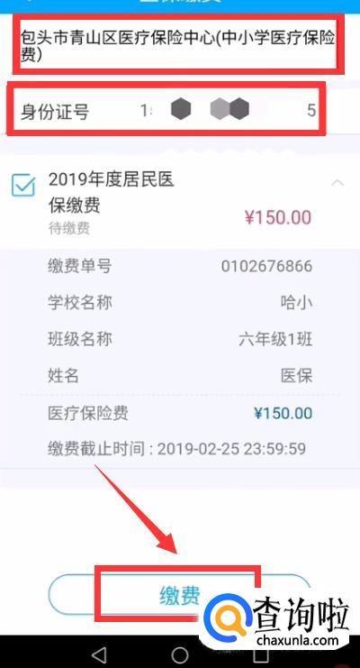 然后我们检查一下地址和身份证号是否正确,检查后点击【缴费】。