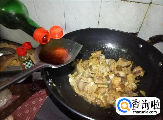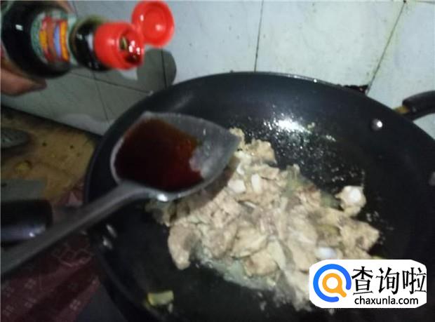 先加入酱油两勺,翻炒均匀;