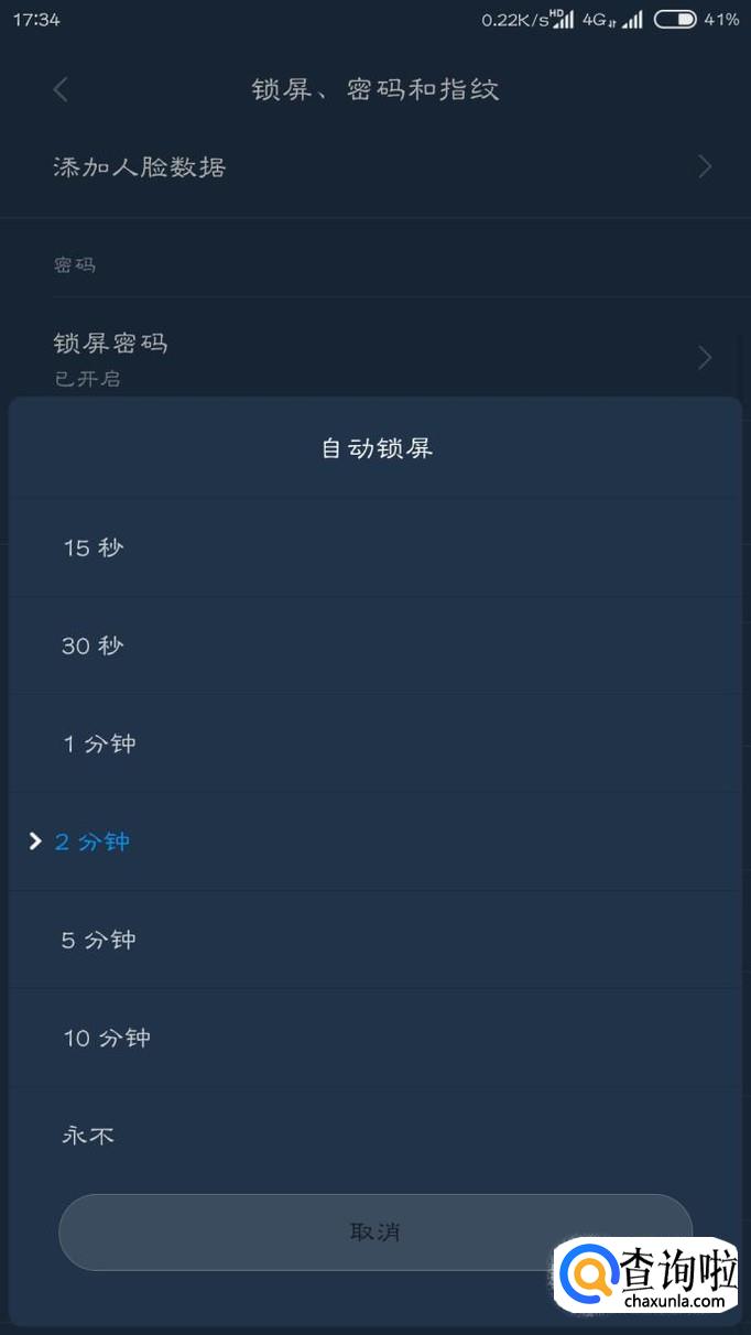 向下拉找到屏幕自动熄灭时间,系统默认的是30s,点击即可更改。