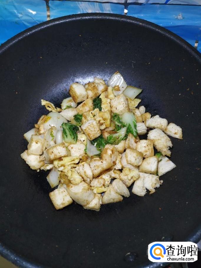 将之前炒好的馒头块倒入锅中,然后将炒好的鸡蛋也倒入锅中,翻炒均匀。