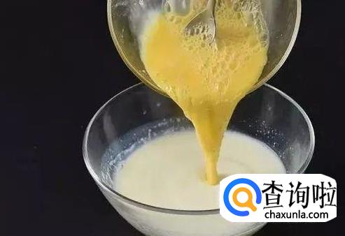 牛奶晾凉后和鸡蛋混合搅拌均匀,然后用薄膜盖住。