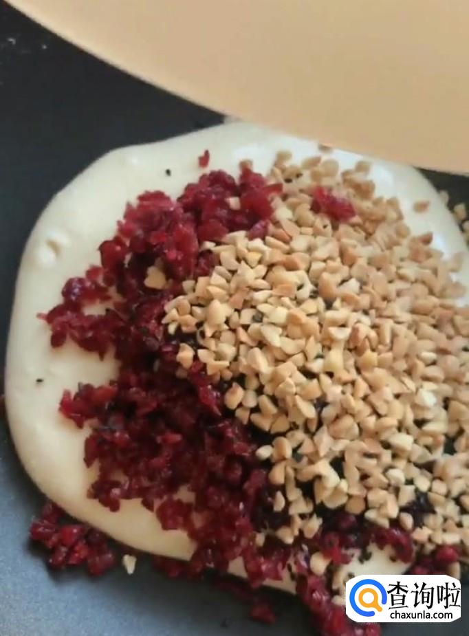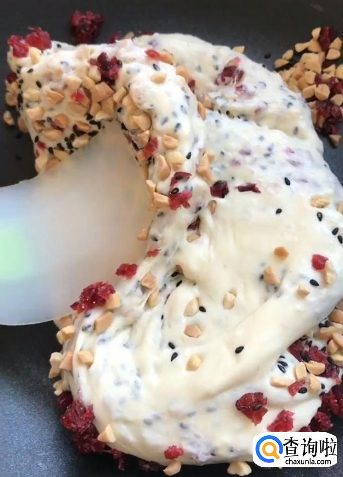 接着我们将50g黑芝麻,50g蔓越梅干,50g花生碎放入锅中翻拌至融合