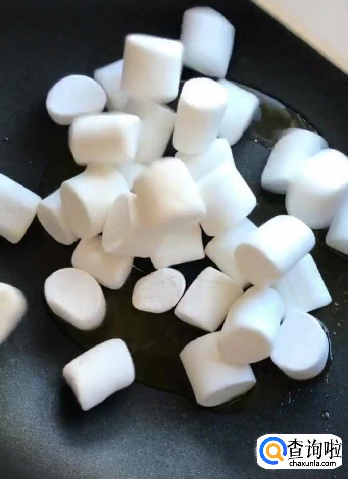 然后我们将150g棉花糖放入锅中,加入100g奶粉,炒至完全融化关火