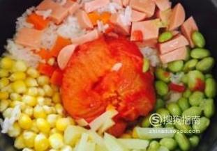 准备一些米,按平常饭量准备,淘洗干净后放入电饭煲,然后放入一个番茄,在番茄顶端用刀划个十字,再放入切好的胡萝卜,黄瓜,火腿肠,香菇,玉米粒是在超市买的现成的,也放上去,最后淋上一点酱油和盐。