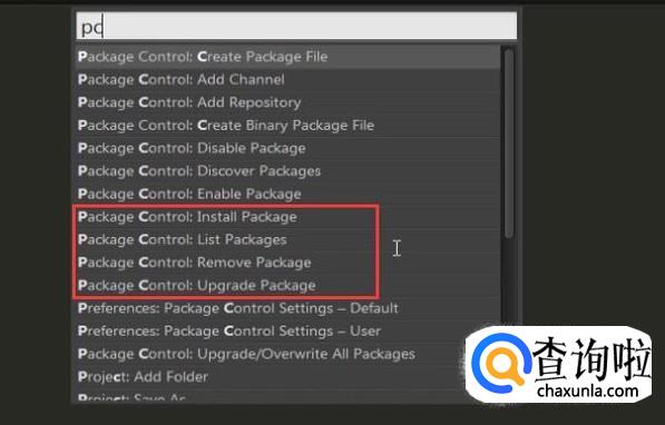 在命令行模式输入PC,你会看到下面列举了很多package control的内容,我们比较常用的就是下图红线框内的了