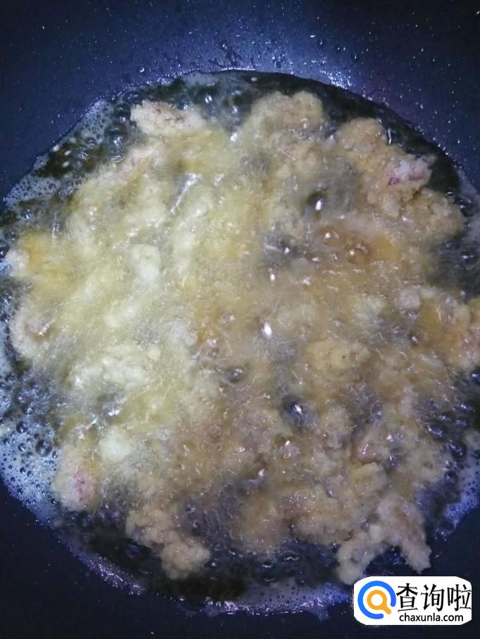 油锅放油,油温五成热,将牛肉条放入锅中,小火慢炸。
