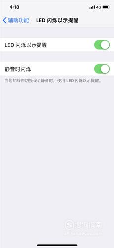 然后在辅助功能中往下划,找到“LED闪烁以及提醒”。点击“LED闪烁以及提醒”后面的按钮,显示绿色就代表LED闪烁灯打开了。