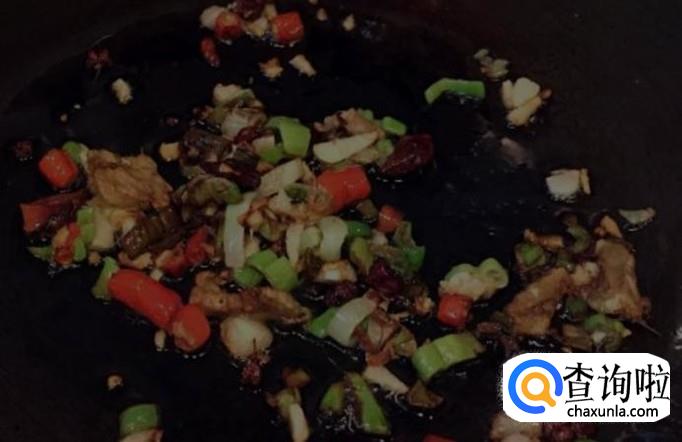 然后我们在刚刚炸过鸡的油锅中放入辣椒,花椒,葱姜蒜,爆炒
