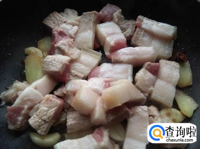 将五花肉放入锅中,小火煸炒出油脂,五花肉多煸炒会,吃起来才不会腻