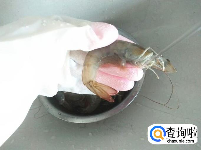 很严肃的告诉大家,清洗青虾的时候一定要戴上手套,今年有好几起因为清洗青虾被扎而引发截肢甚至夺走生命的事件了,所以这一点一定要注意。戴上胶皮手套,将化好冻的青虾放在水龙头底下一只只的全部清洗干净。