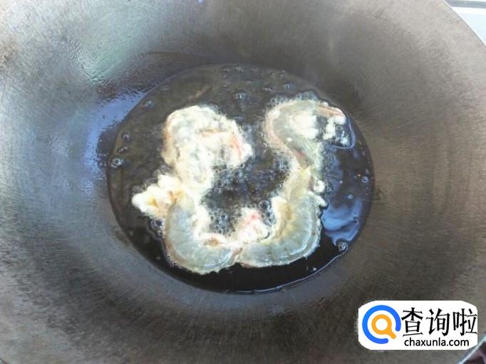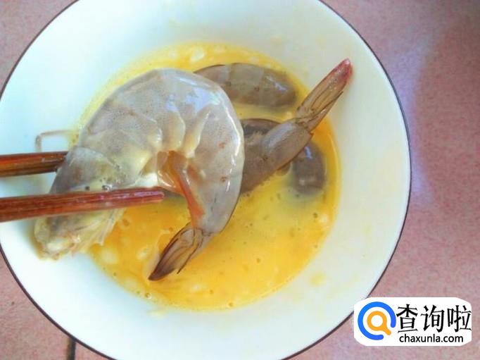 鸡蛋糊做好之后,青虾放进去,全身裹满鸡蛋液。
