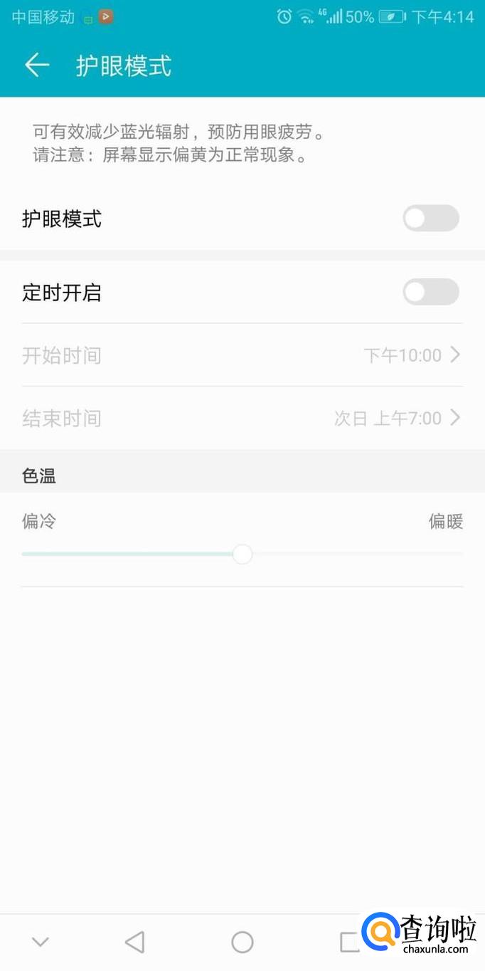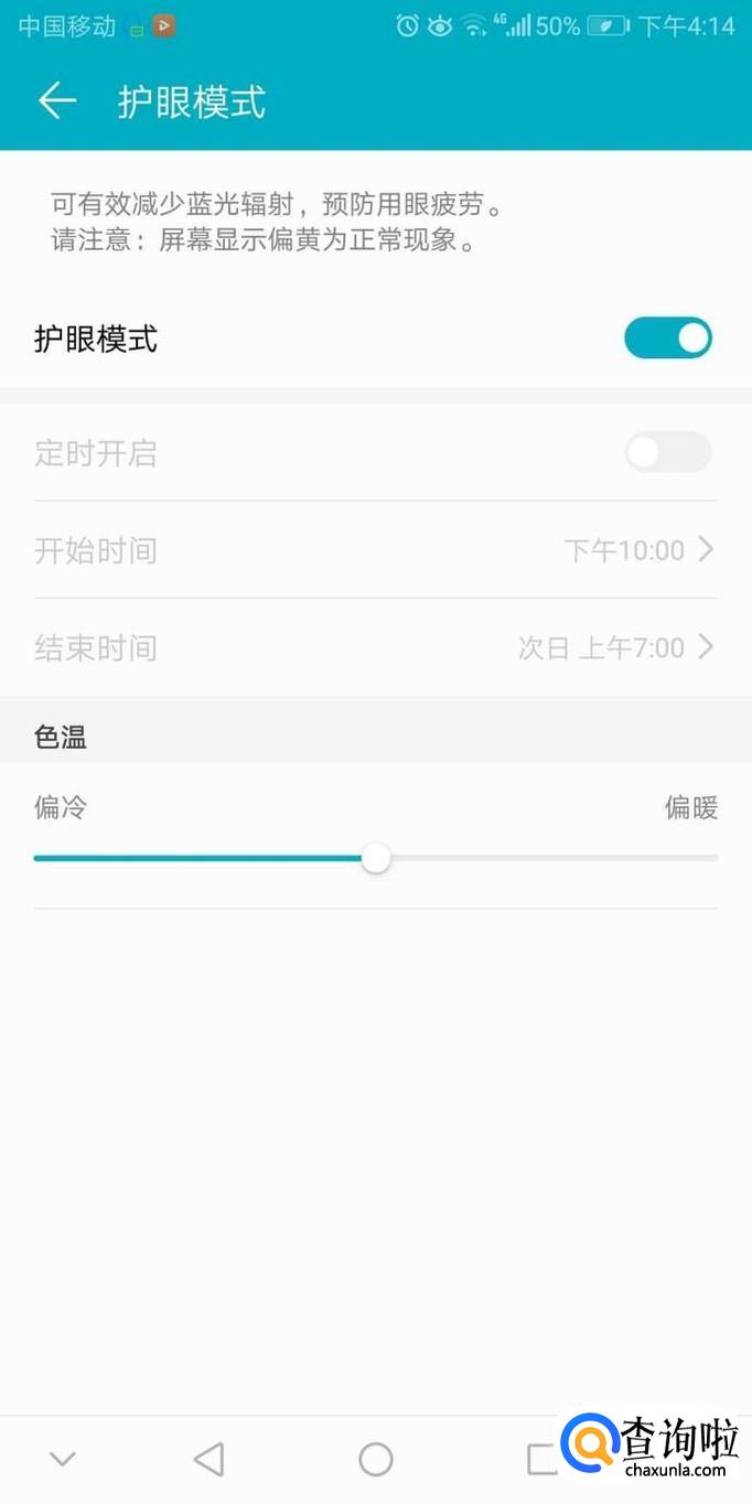 点击护眼模式右侧的打开按钮即可完成设置,拖动下方的色温显示条可以调整屏幕亮度。