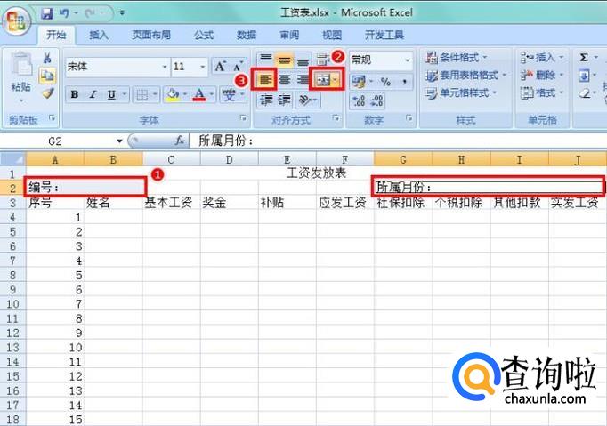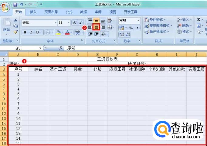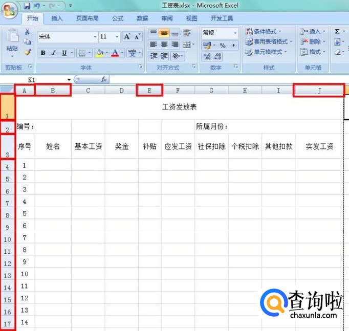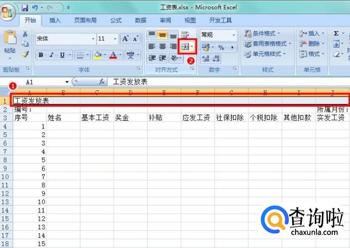 选中“工资发放表”所在行的A到J单元格,点击“合并居中”按钮,作为表头;