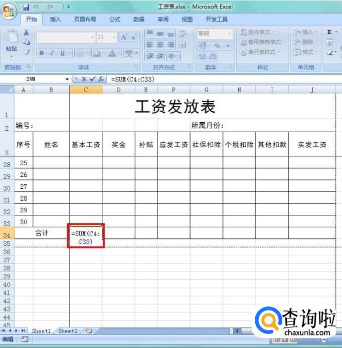 最后合计行添加求和函数=SUM(X4:X33),然后就会根据上面的数据自动求和了;