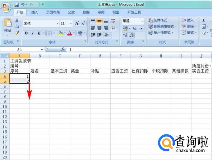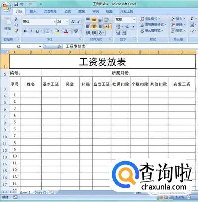 调整字体及大小,前三行字体都改为黑体,“工资发放表”字体大小为26,第2行字体大小为12,后面字体大小维持11不便;