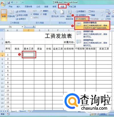 可以设置冻结窗格,方便工资表的浏览,如图选中单元格,冻结拆分窗格;
