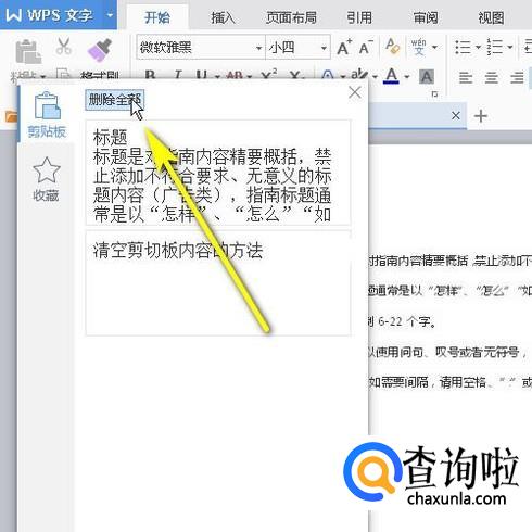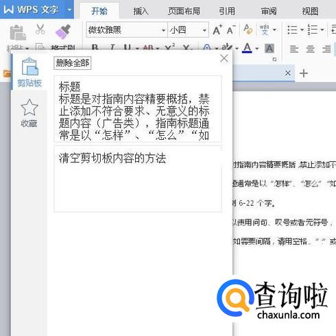 剪贴板中即显示着刚才复制的内容;若想清空剪贴板的内容,只要点击:删除全部