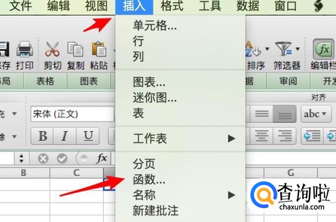 然后点击菜单栏上的插入,函数。