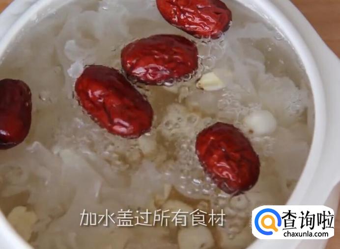 在炖锅中放入银耳、莲子、红枣和冰糖,加水盖过所有的食材。