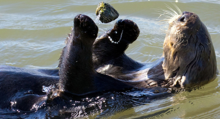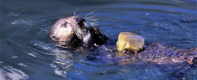 海獭是海洋动物,它们的食物大部分是贝类、海胆、螃蟹等有坚硬外壳的海底生物。当遇到难以下口的食物时,海獭就会把随身携带的石头放在腹部,然后把食物往石头上用力猛击,直到外壳被敲破,便可将里面的肉质部分吸食出来。