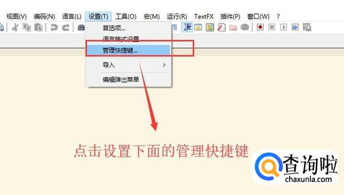 接下来我们需要给TextFX设置快捷键,点击顶部的设置菜单,然后选择下拉菜单中的管理快捷键选项,如下图所示