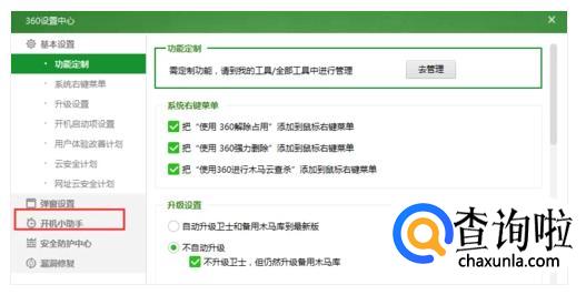 进入到360安全卫士的设置页面,在页面的左侧栏目中,找到开机小助手选项,点击打开。