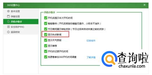 这时,在页面的右侧我们将可以看到开机小助手下方有一个显示热点新闻栏目,我们把前面的√去掉即可。