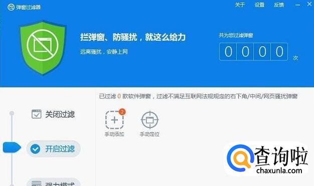 打开弹窗拦截后,选择“开启过滤”,点击“手动添加”;