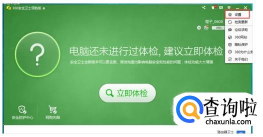 在电脑上打开已经安装好的360安全卫士,进入到卫士的首页,在页面右上角有一个下拉菜单图标,点击它,这时,页面右上角将会弹出一个下拉菜单,在里面选择打开设置选项。
